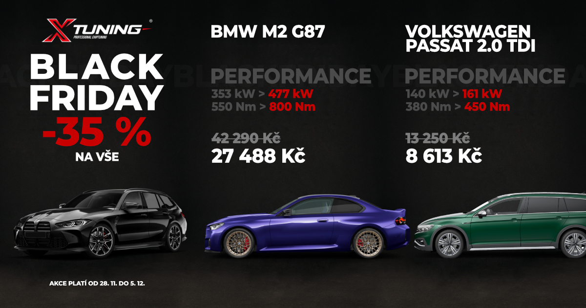* Sleva -35 % platí pouze na služby objednané v období 28. 11. – 5. 12. 2025 a realizované nejpozději do 31. 12. 2025. Sleva se nevztahuje na odemčení ECU a čištění DPF filtrů. Slevy nelze kombinovat s jinými akcemi nebo individuálními nabídkami. Uvedené ceny jsou orientační, finální cena se může lišit dle specifikací konkrétního vozu. Společnost XTuning si vyhrazuje právo na změnu podmínek nebo ukončení akce bez předchozího upozornění.